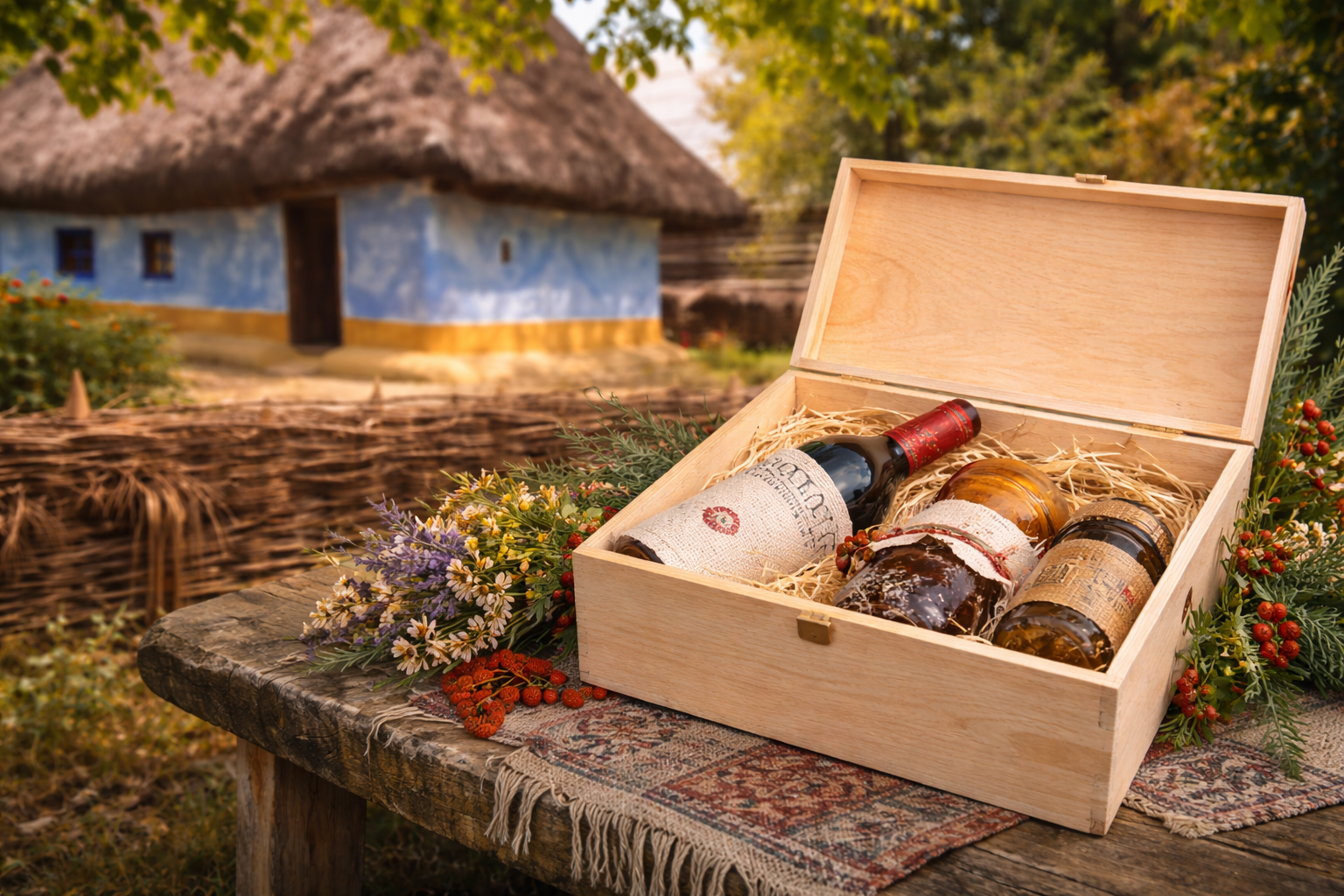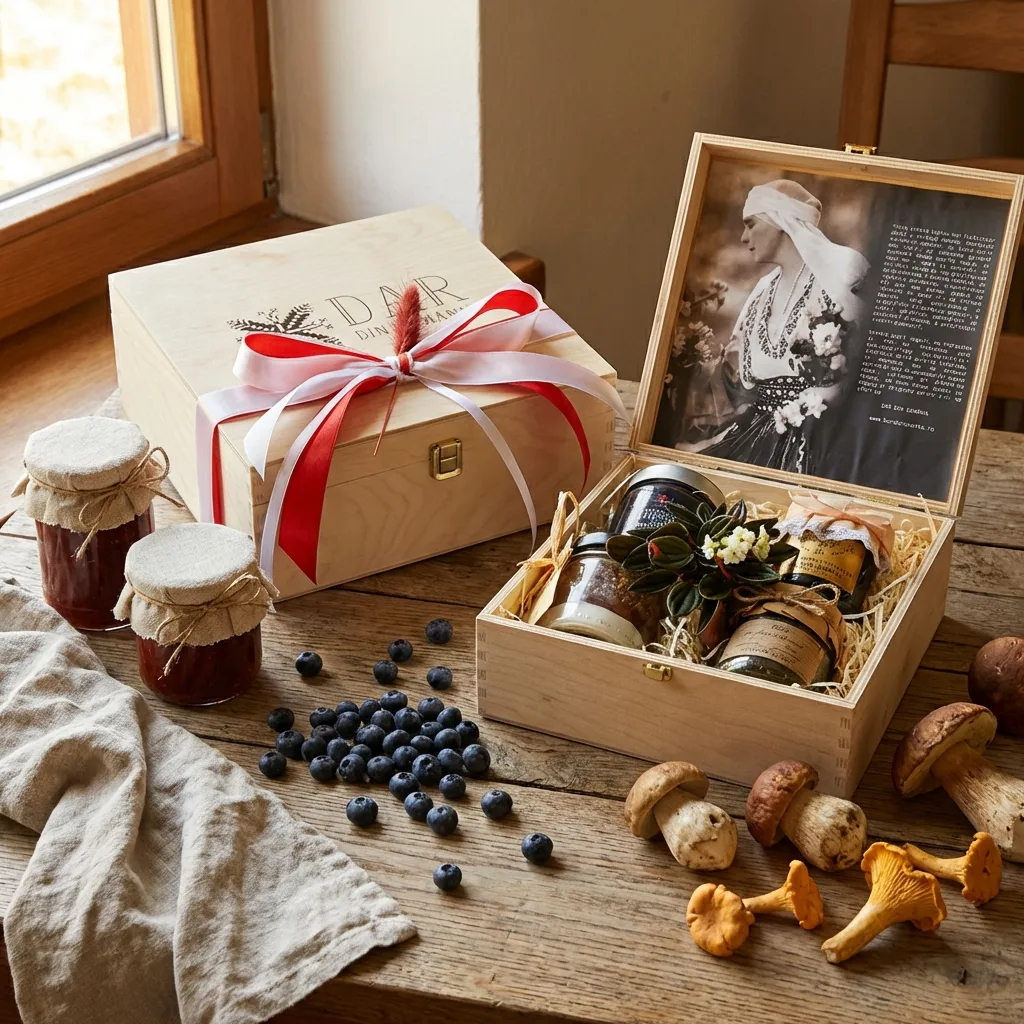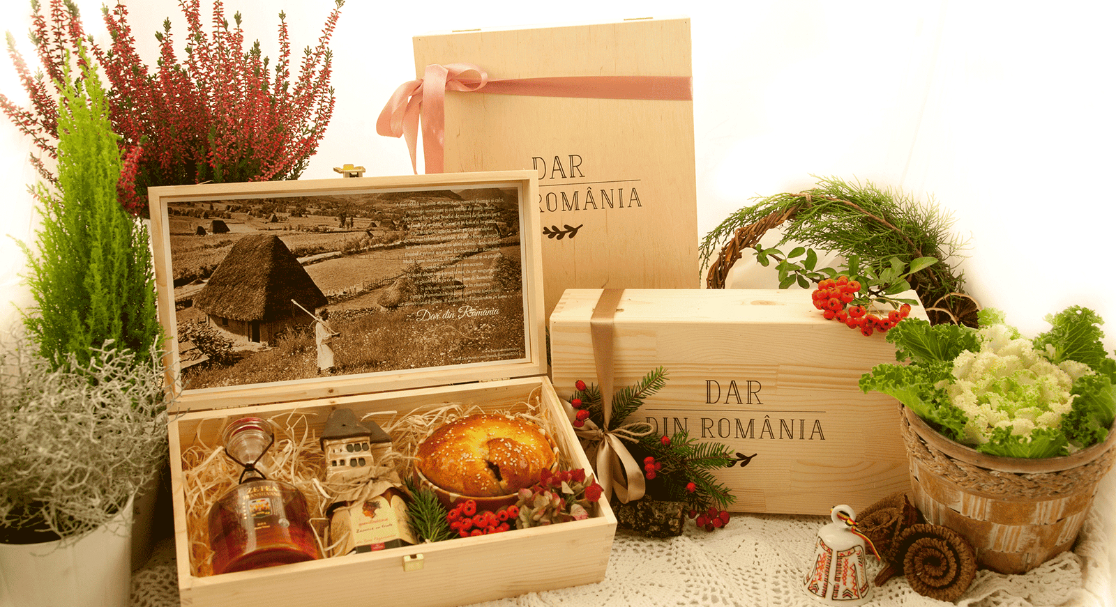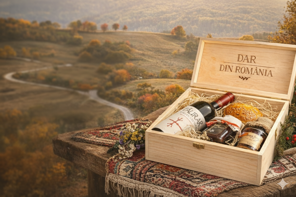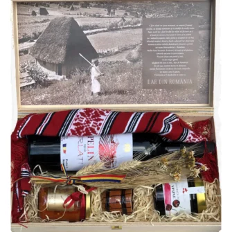 Primește un coș cu produse autentice românești, direct de la producători locali și ambalate în cutia din lemn Dar din România.